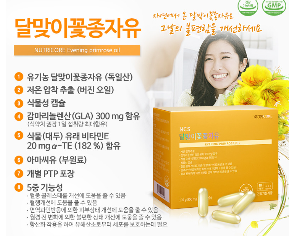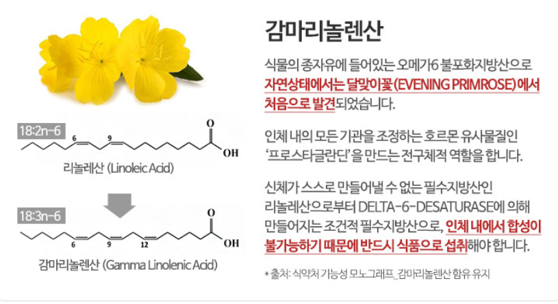 ▶ 감마리놀렌산(GLA): 필수지방산으로, 호르몬 조절, 염증 억제, 피부 건강에 도움