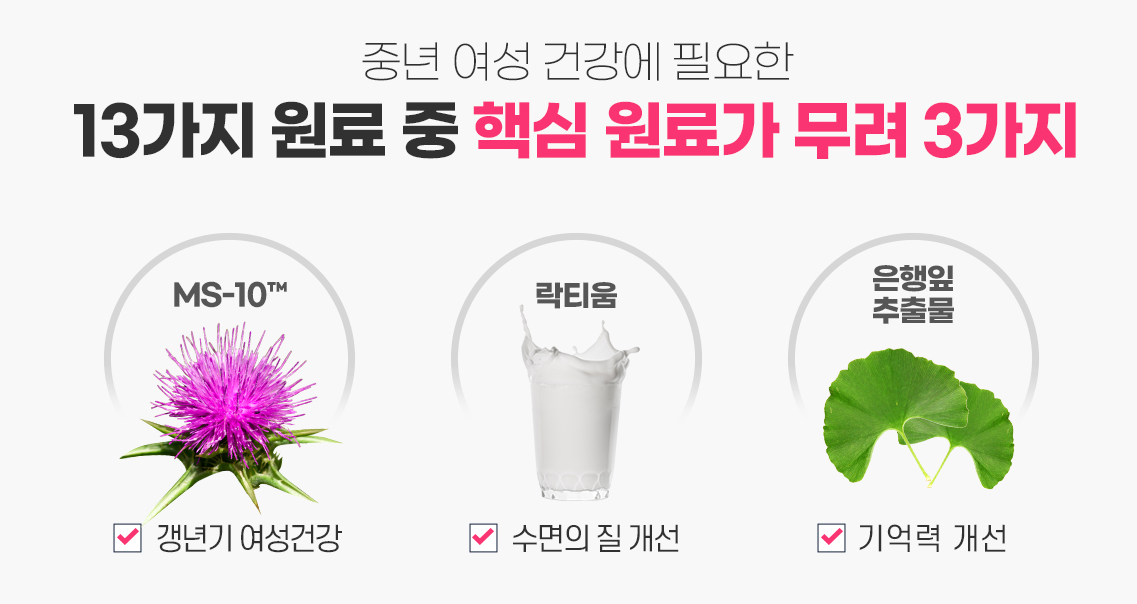 여성 갱년기 전용 프리미엄 브랜드답게, 성분 배합이 매우 체계적입니다.