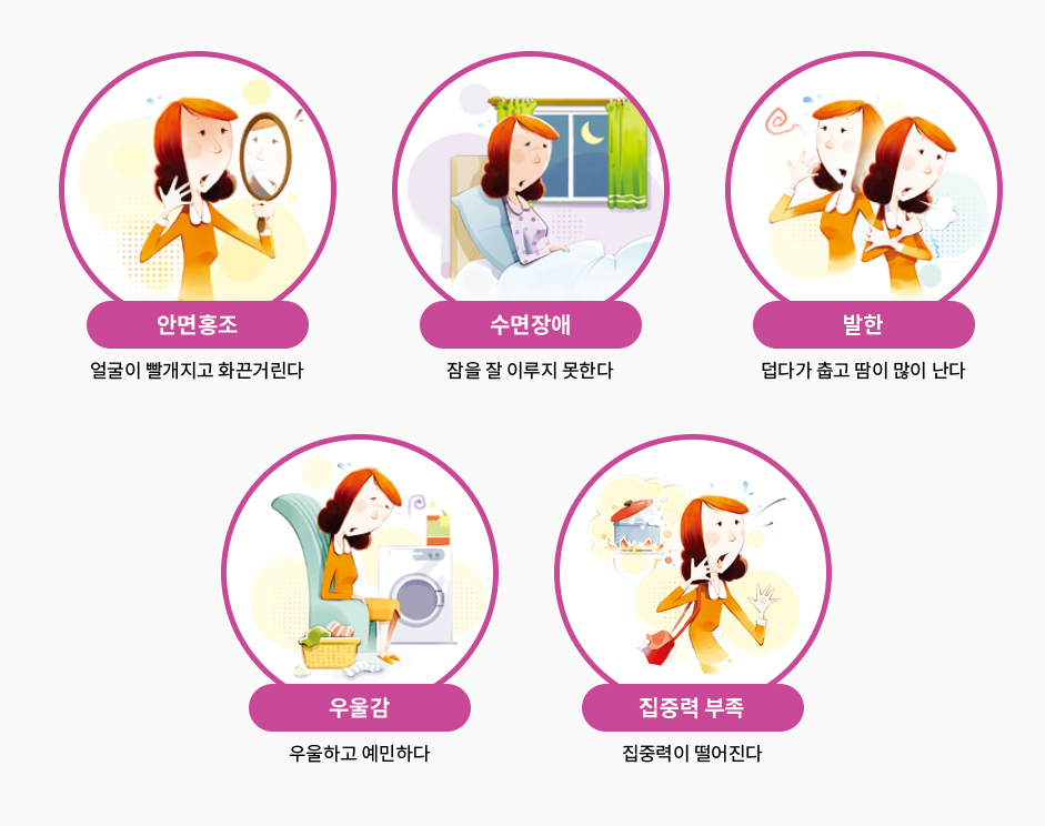 에스트로겐 부족으로 인한 안면홍조, 발한, 수면장애, 질건조, 우울감 등 갱년기 증상을 직접적으로 개선합니다.